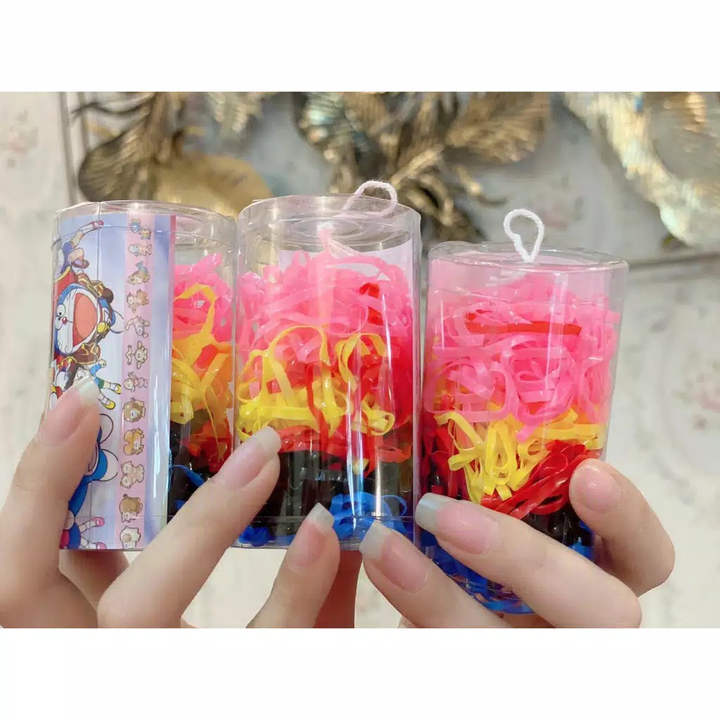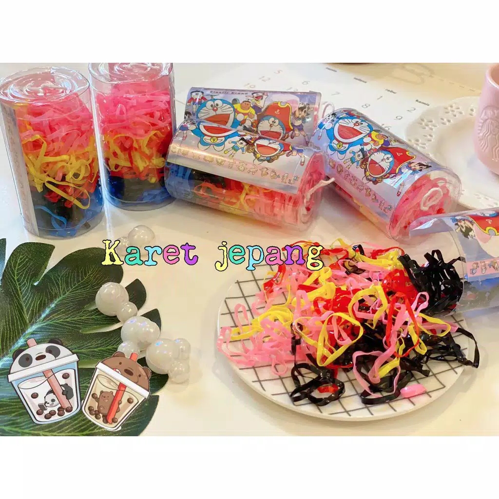 1set karet jepang yang dikemas dalam toples motif Line dengan berbagai warna yang menarik yang cocok digunakan untuk menguncir rambut, merias rambut menjadi berbagai model dan sebagainya. 1 toples berisi ratusan pcs karet beda warna. Ukuran toples 8x8x6cm.